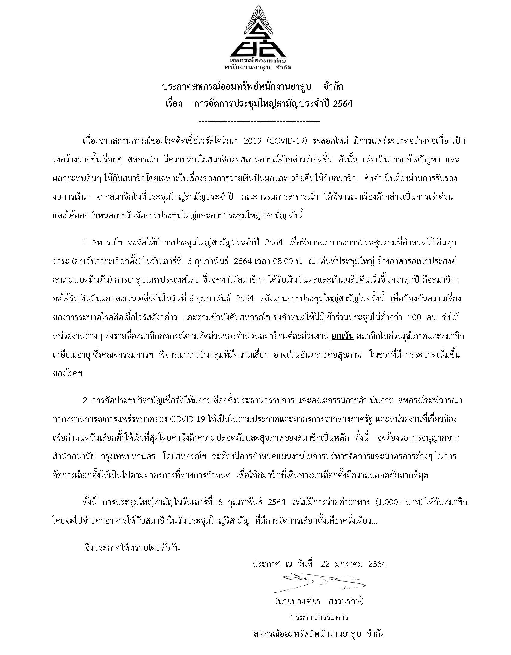 ประกาศการจัดประชุมใหญ่สามัญปประจำปี 2564..