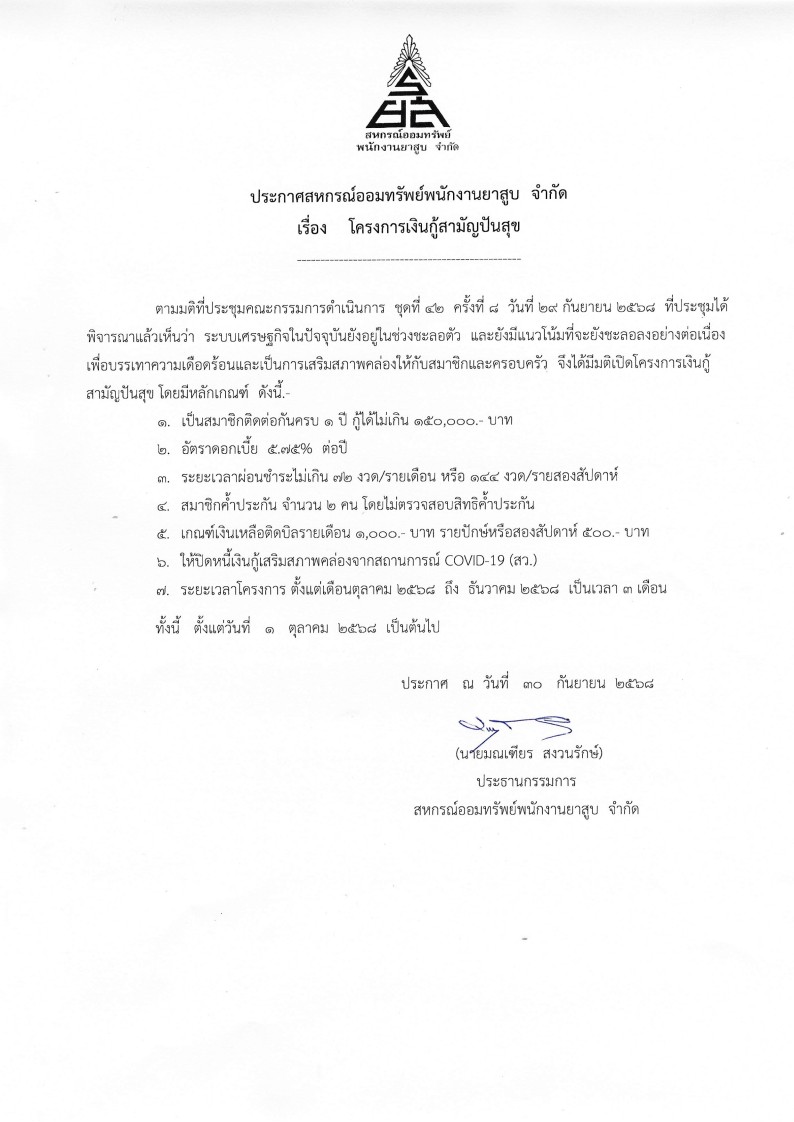 ประกาศสหกรณ์ฯ เรื่อง โครงการเงินกู้สามัญปันสุข