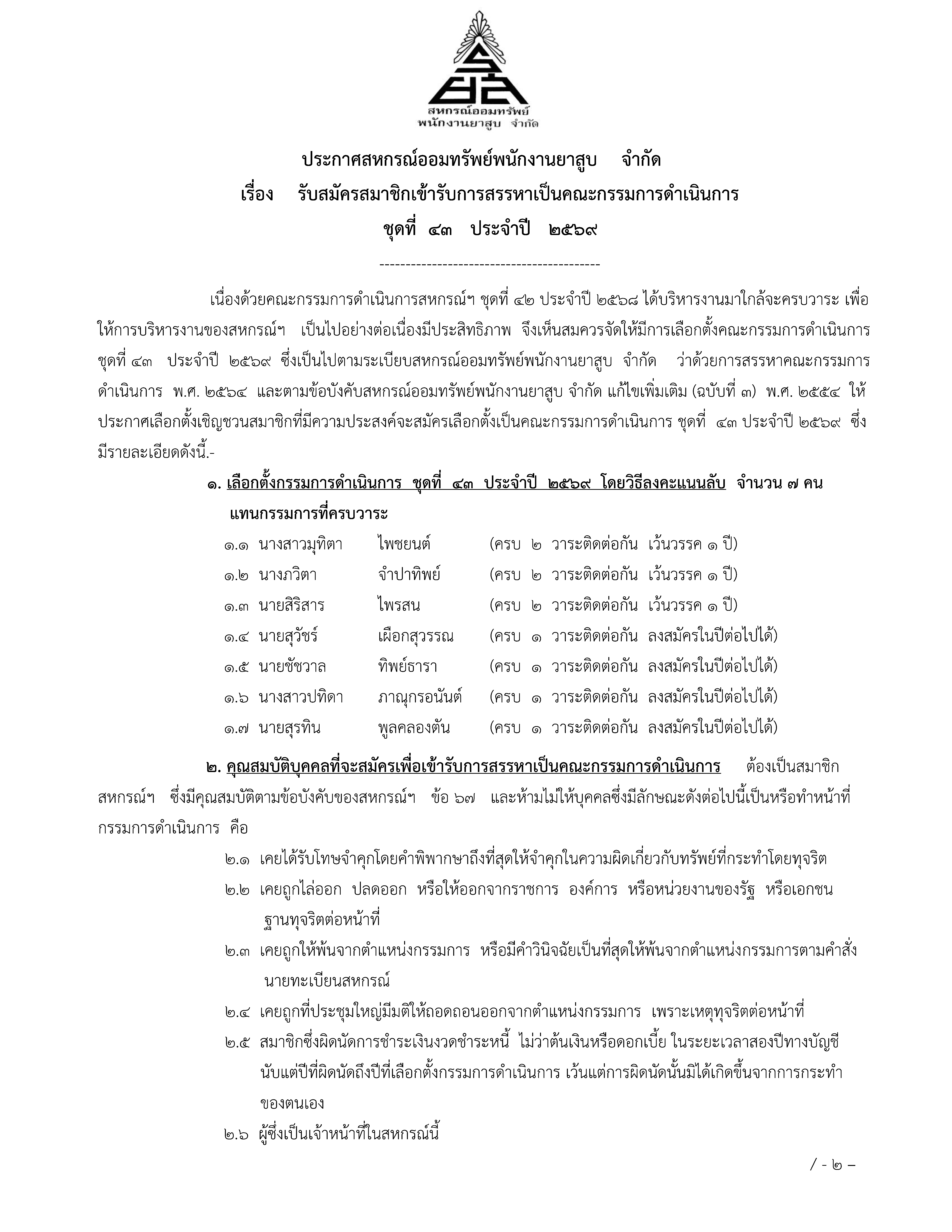 NEWS ประกาศสหกรณ์ฯ เรื่อง รับสมัครสมาชิกเข้ารับการสรรหาเป็นคณะกรรมการดำเนินการ ชุดที่ 43 ประจำปี 2569 29 ธันวาคม 2025 Kriskhajorn Boonyasopat