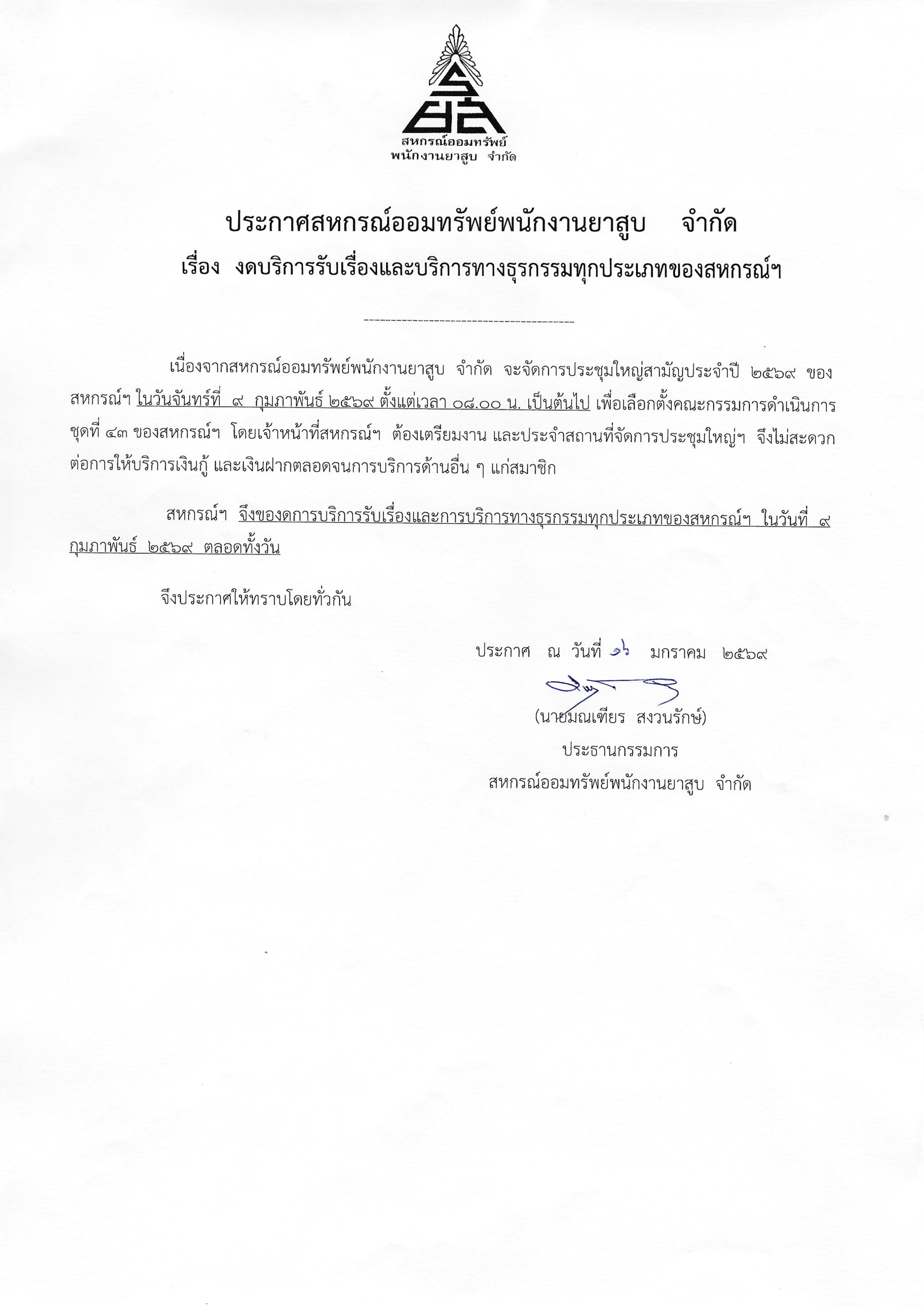 • ประกาศสหกรณ์ฯ เรื่อง งดบริการรับเรื่องและบริการทางธุรกรรมทุกประเภทของสหกรณ์ฯ 22 มกราคม 2026